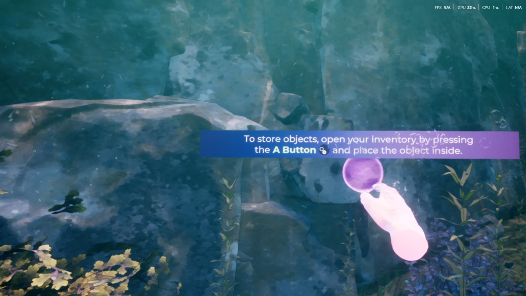 Flüssig, ihr versteht, das ist das, was man im Wasser generell so erwarten würde. Die Schwimmsteuerung ist zähflüssiger als ein Marsch durch ein Meer aus Honig und intuitiv ist auch etwas anderes. Aber das war alles noch kein großes Ärgernis, das kam im Tutorial, als ein kugeliges Fragment gegriffen werden musste. Was aber nicht ging, weil mit zwangseingeblendetem Tutorial-Tip keine Bewegung möglich ist und das Fragment so nicht greifbar war. Toll.