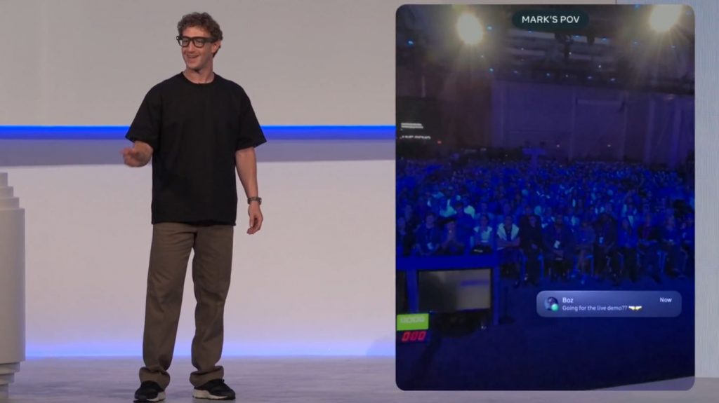 Schon der Beginn der Connect startete mit der Meta Ray Ban Display- Zuckerberg blättert durch ein Manuskript, wird dann zur Bühne gerufen zum Beginn der Connect und setzt sich eine Brille auf, die offenbar die ganze Zeit unseren Stream gefilmt hat. Auf dem Weg zur Bühne schreibt er noch ein paar Nachrichten und schaut sich Chatnachrichten an.